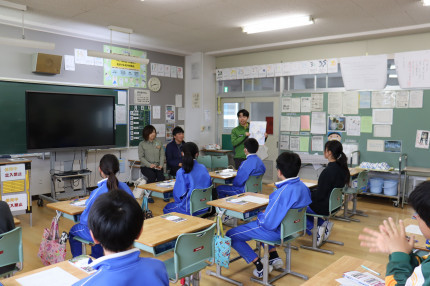 3年生は総合的な学習の時間において、地域に伝わる文化や願いが込められた「御祝い」について学習を進めています。今回は、地域の伝承会より齋藤祥子さんと齋藤昌子さんのお二人をお迎えし、御祝いに込められた意味や由来についてお話をいただきました。 御祝いは、もともと漁師さんたちが歌っていたものであり、漁の安全や大漁を願う思いが込められていることを教えていただきました。また、歌の途中で見られる櫂(かい)をつく動作には「大漁の合図」という意味があること、さらにはちまきには「働く気持ちを高めるための願い」が込められていることなど、地域に伝わる歌や踊りの一つひとつに深い意味があることを知ることができました。子どもたちは、お二人のお話に真剣に耳を傾け、実際に歌や動作を体験する中で、地域の人々が大切に受け継いできた願いや思いを感じ取りました。学習を通して、地域文化への関心がさらに高まり、ふるさとへの誇りをより深める機会となりました。
