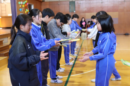 3月5日(水)3月5日に「6年生を送る会」が行われました。この日のために、新執行部を中心として、全校で準備を進めてきました。1年生は招待状を6年生一人ひとりに手渡しました。2年生は「ありがとうメッセージ」を心を込めて作り、3年生はステージを彩る「6年生をおくる会」の題字を書き上げました。4年生はステージの飾りつけを担当し、会場を華やかに仕上げました。5年生は縦割り班ごとに、これまで班をまとめてくれた班長の6年生へ感謝のメッセージを綴りました。本番では、各学年がこれまでの感謝の気持ちを込めた、呼びかけやクイズ、ダンスなどの発表を行い、会場は温かい雰囲気に包まれました。6年生からは、美しい合唱のプレゼントがありました。在校生の「ありがとう」の気持ちが伝わり、6年生からは「ありがとうと言ってくれてありがとう」の思いが、表情に表れていました。これまで一緒に過ごしてきた日々を振り返り、大好きな広田小学校での思い出を胸に、互いに感謝の気持ちを伝え合う、心温まる会となりました。