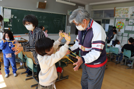 3月9日(月)に1年生が生活科の学習で昔遊びを行いました。学習では地域の7人の先生からけん玉、おはじき、あやとり、お手玉、コマ回しの遊び方を教えていただきました。子どもたちは、昔の遊びの楽しさを全身で感じとり、笑顔一杯になりました。地域の先生を親しみを込めて呼ぶなど、和やかに交流することができました。
