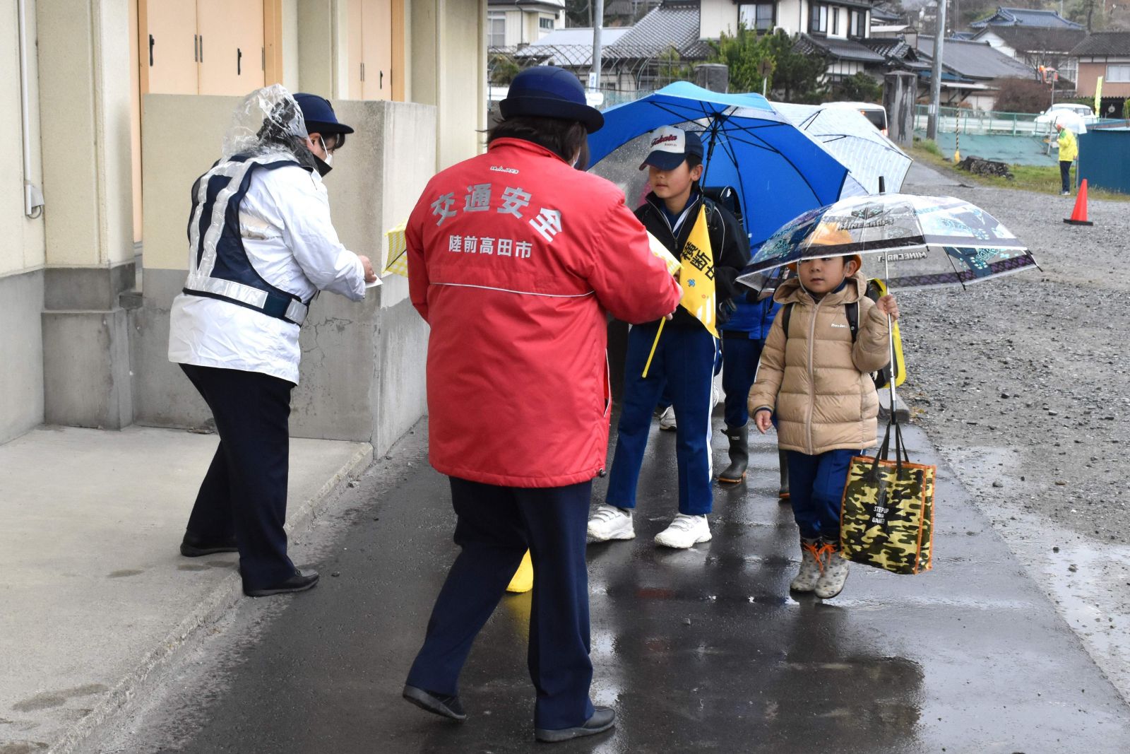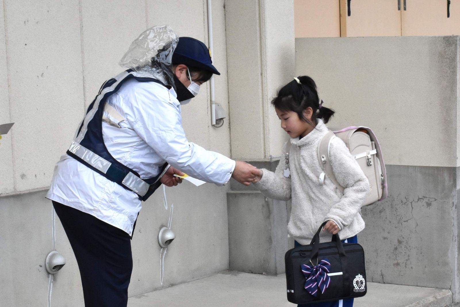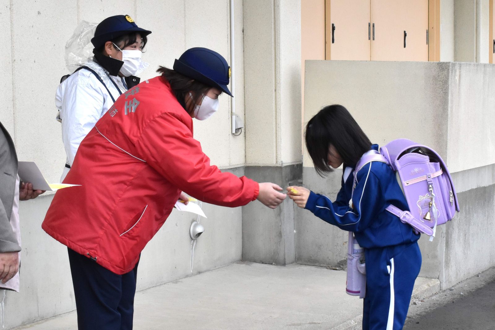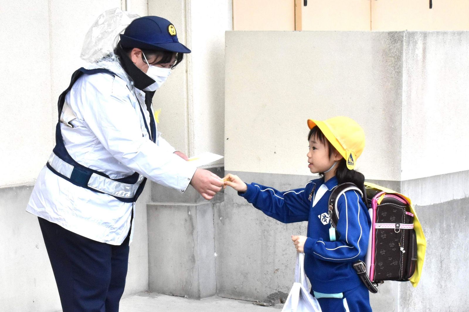 運動期間中の10日(金)の登校時には、校門の前において交通指導員の方から黄色い羽根が配られました。