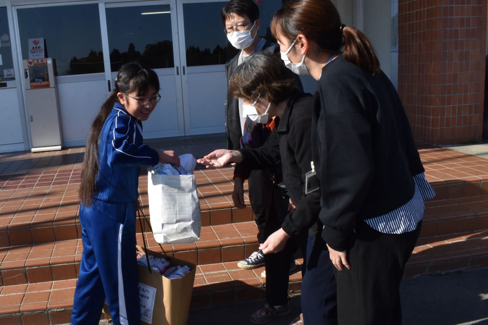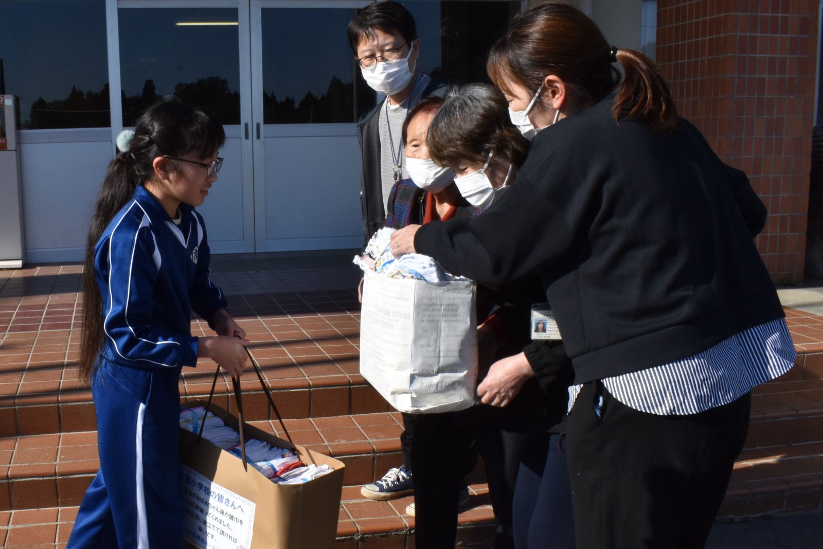 全校児童を代表して保健委員長が、「私たちのためにありがとうございます。大切に使わせていただきます。」と感謝のことばをのべ、200枚の手縫いのぞうきんを受け取りました。