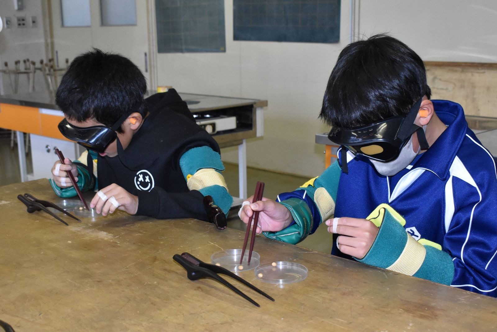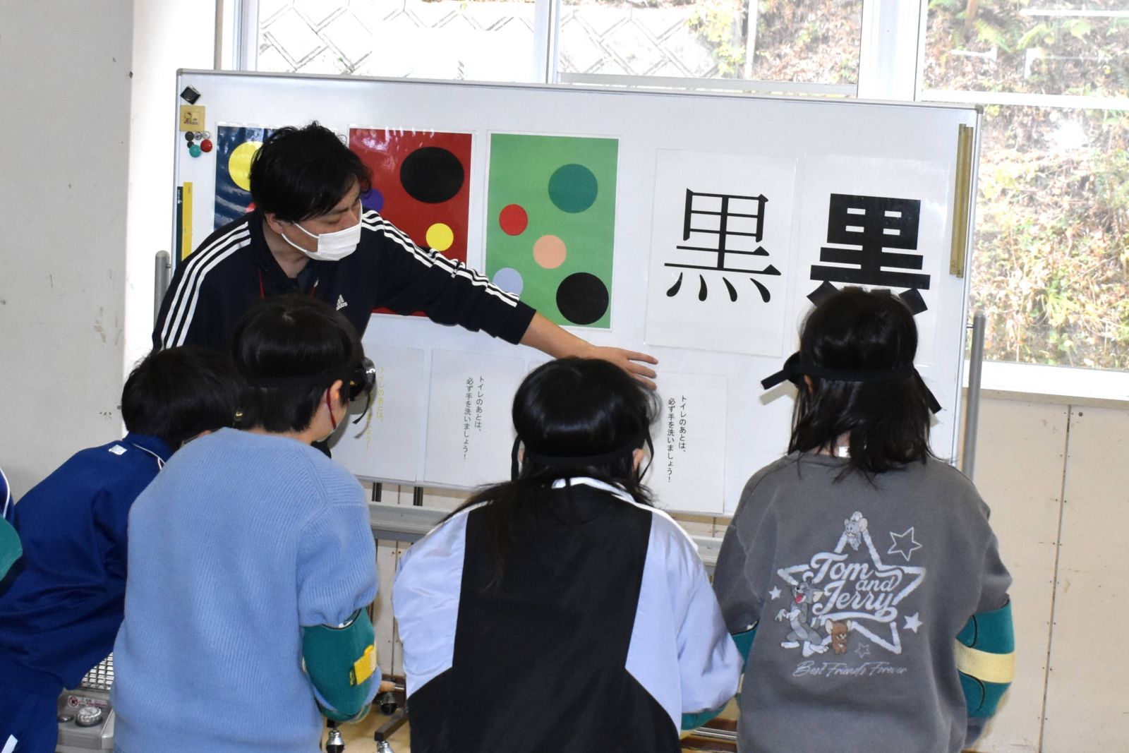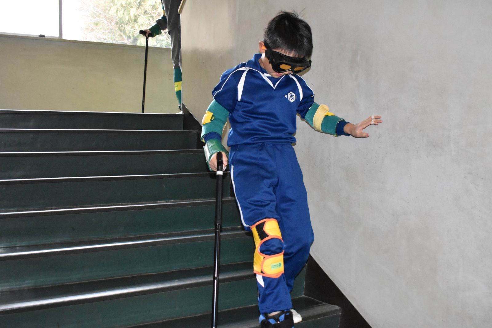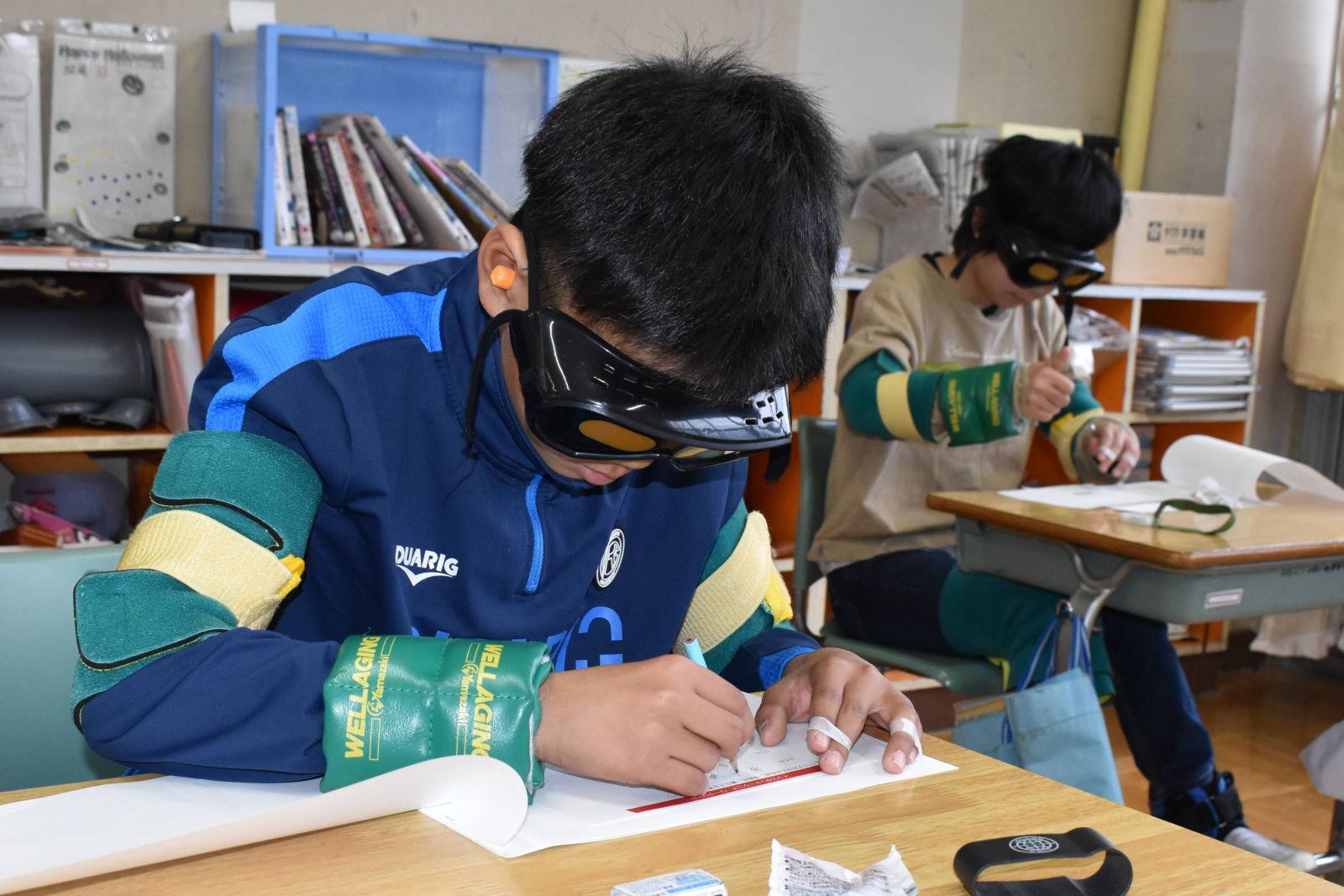 12月3日(水)5年生は総合的な学習の時間に「高齢者疑似体験」に取り組みました。当日は、大船渡市の県立福祉の里センターから講師をお招きし、加齢による身体的変化を体験しながら、高齢者の苦労や気持ちについて理解を深めました。学習の中では、手足におもりをつけ、特殊眼鏡や耳栓を身に着けた状態で、字を書いたり、階段を下りたり、着替えたりしながら、いつもとは異なる不自由さを体感していました。