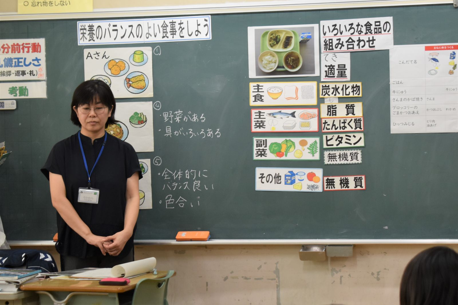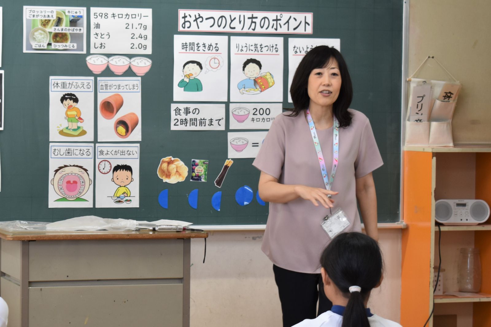 9月26日(金)、給食センターの先生による食育指導(2回目)が高学年を対象に行われました。4年生は「おやつのとり方を考えよう」、5年生は「栄養のバランスのよい食事をしよう」、そして6年生は「生活習慣病の予防」のテーマのもと、それぞれ学年に応じた内容で進められました。学習の振り返りで4年生は「おやつを食べるときには、時間や量に気を付けたい。」「これからは砂糖や油の量などを気を付けながら食事をしたい。」と、早速理解を深める姿が見られました。