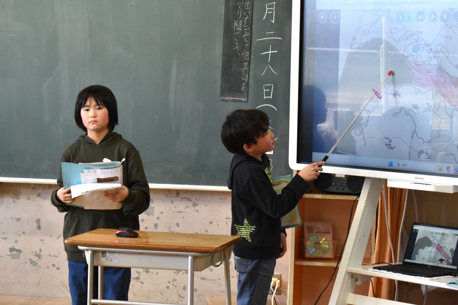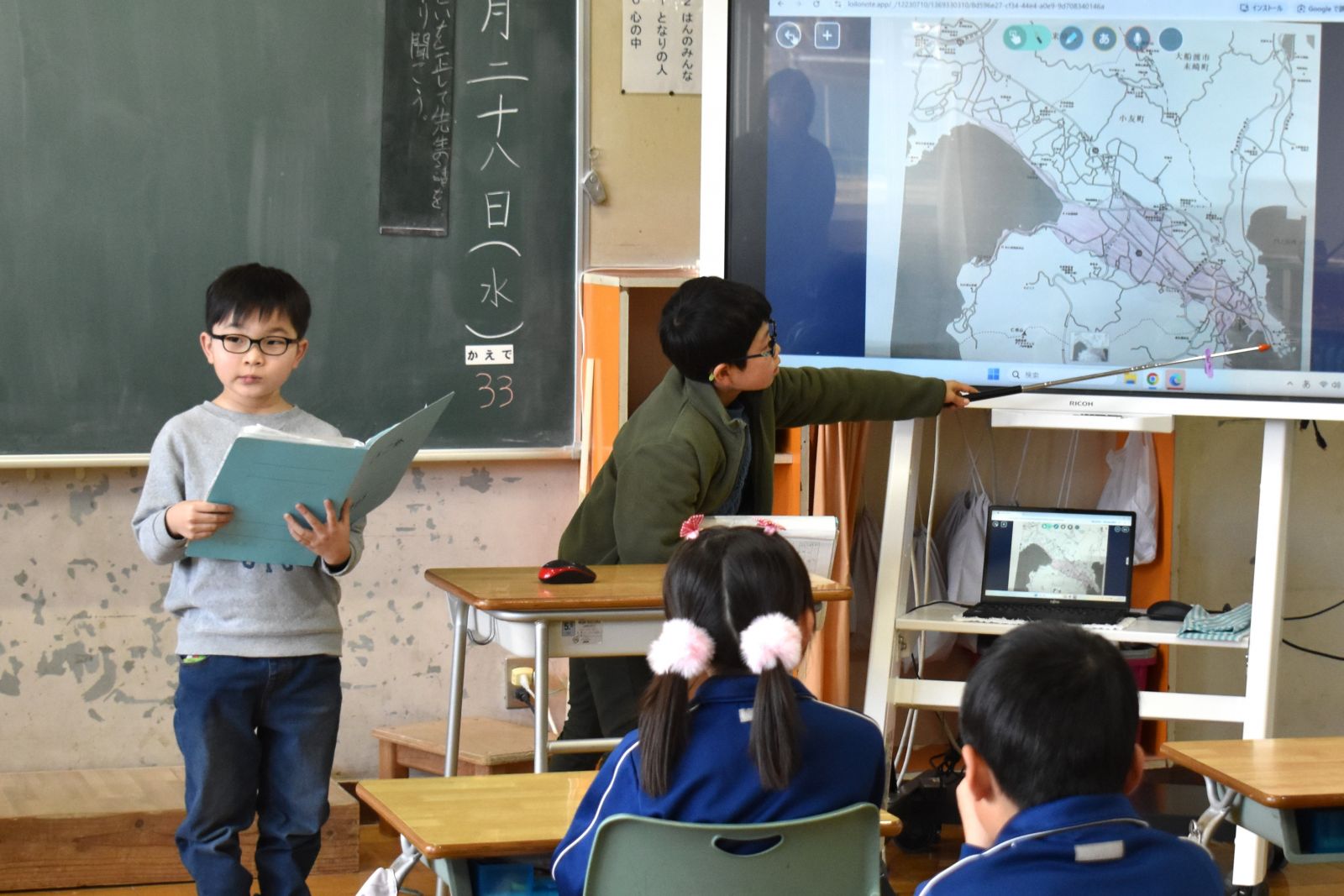 1月28日(水)、3年生は総合的な学習の時間で取り組んできた「防災マップ作り」を通して得た学びを、プレゼンテーション資料としてまとめ、2年生に向けて発表しました。