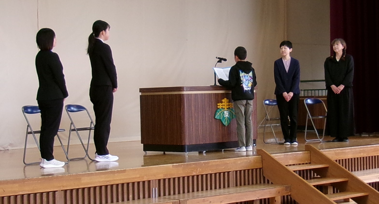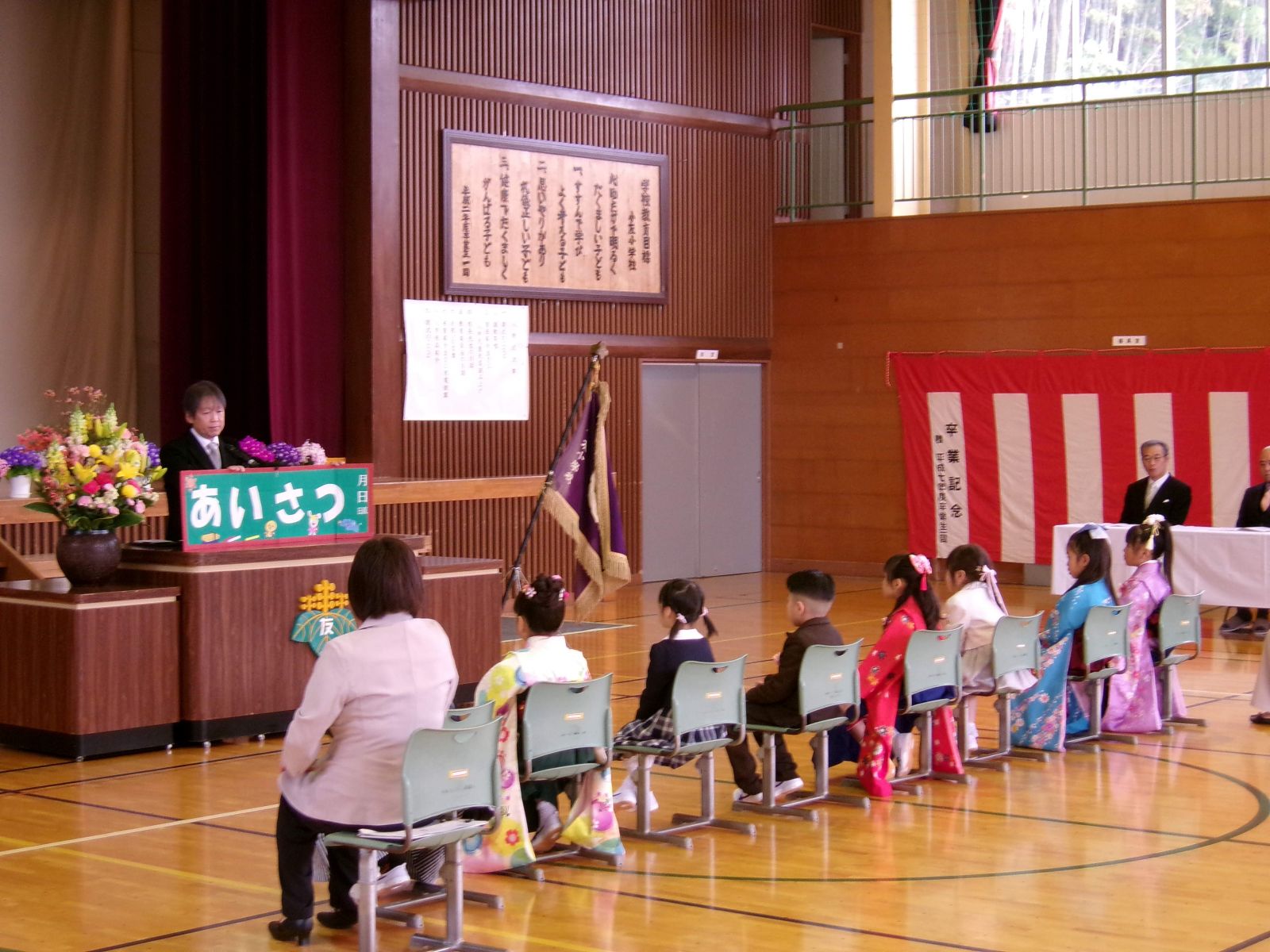 式では、地域の来賓の方々や在校生の代表として参加した6年生に迎えられながら