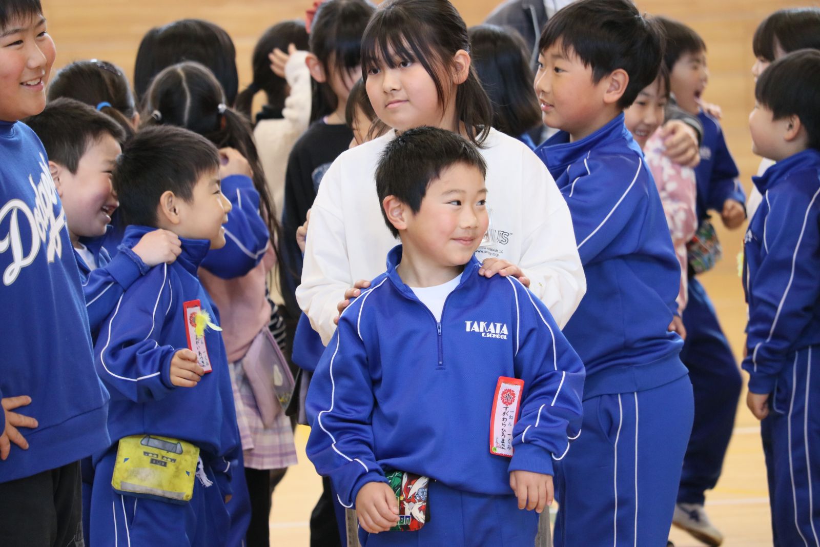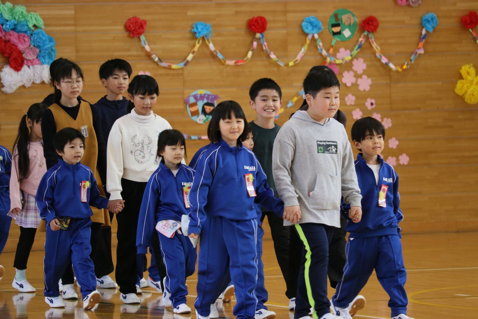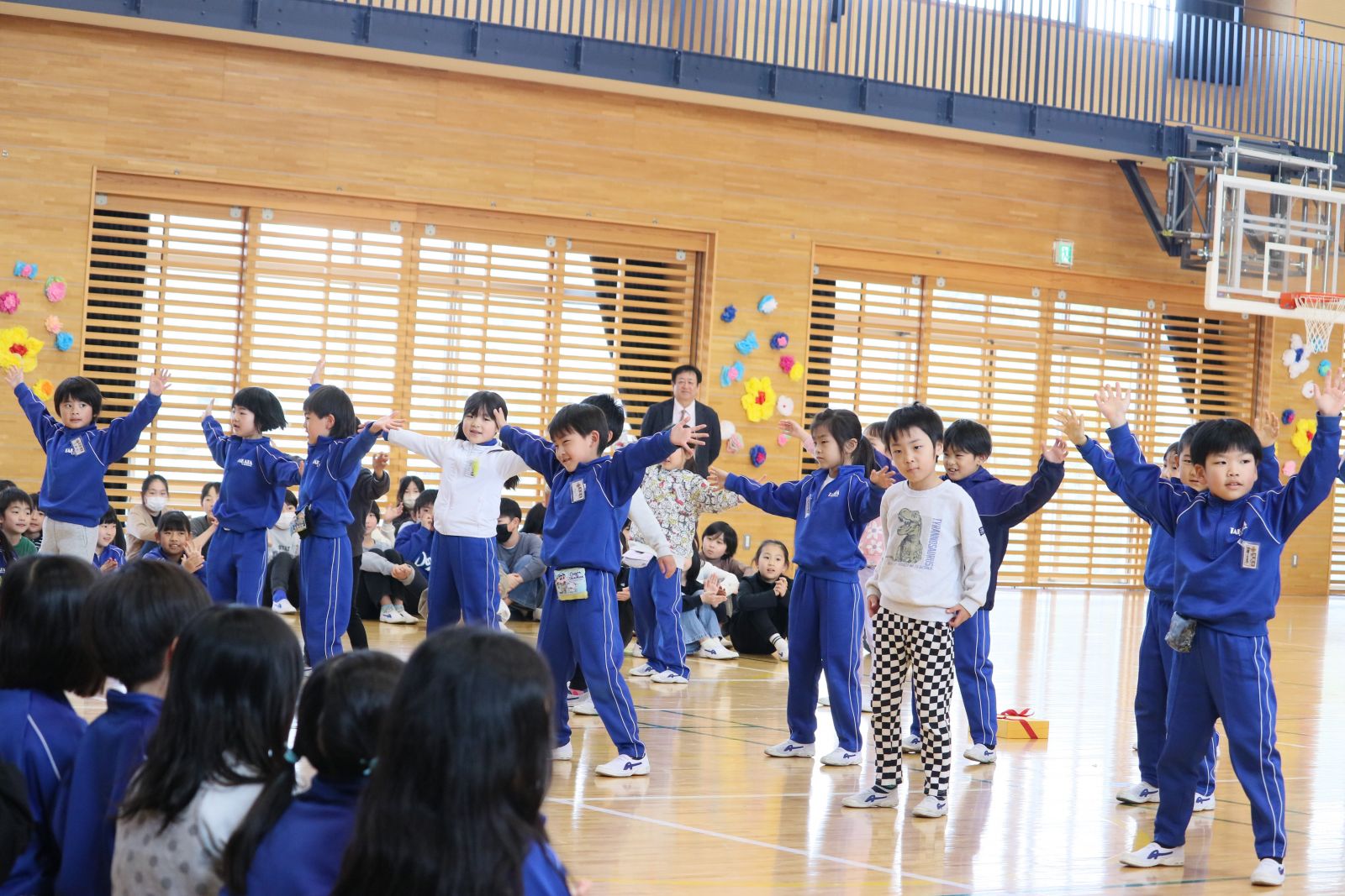 まず、6年生と1年生が手をつなぎ、なかよく入場しました。次に、開会の言葉を担当した3年生、ダンスやプレゼントをしてくれた2年生、招待状を作って届けてくれた5年生、会場の装飾をしてくれた6年生、閉会の言葉を担当した4年生、それぞれの学年が1年生を温かく迎え入れようと一生懸命がんばりました。1年生は、自分の名前と好きな物を堂々と発表しました。また、全校でクイズやじゃんけん列車も行い、みんなで楽しく活動することができました。