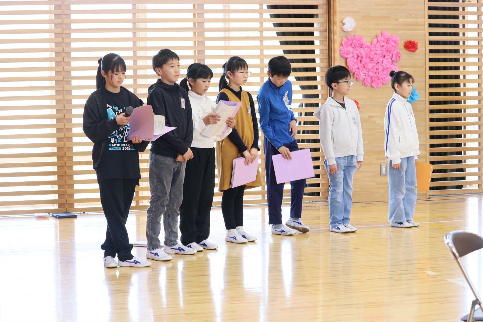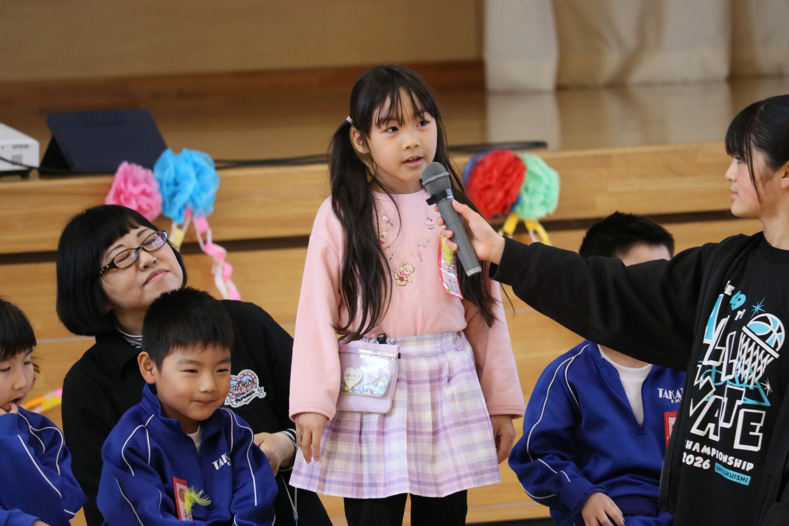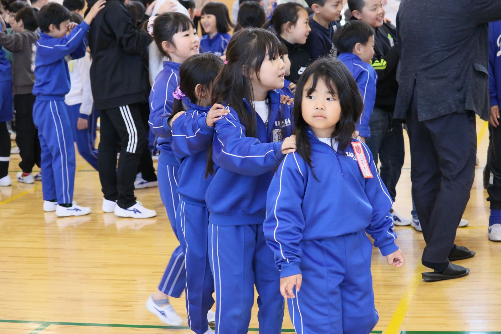まず、6年生と1年生が手をつなぎ、なかよく入場しました。次に、開会の言葉を担当した3年生、ダンスやプレゼントをしてくれた2年生、招待状を作って届けてくれた5年生、会場の装飾をしてくれた6年生、閉会の言葉を担当した4年生、それぞれの学年が1年生を温かく迎え入れようと一生懸命がんばりました。1年生は、自分の名前と好きな物を堂々と発表しました。また、全校でクイズやじゃんけん列車も行い、みんなで楽しく活動することができました。