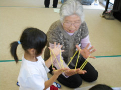 23日(木)の3・4校時に「祖父母に学ぶ会」がありました。全校児童が6グループに分かれ、「昔遊び」「竹でっぽう」「水でっぽう」「小物入れづくり」「なべやきづくり」「ニュースポーツ」と時間いっぱい楽しみました。あいにくの雨模様でしたが、フリー参観にもたくさんの皆様にご来校いただきありがとうございました。写真は、あやとりを教えていただいている様子です。