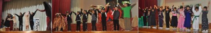 3年生は劇「たぬきばやし」(写真右)。おうちの方や地域の方にもご協力をいただいたおかげで、舞台はすっかり昔話の世界。配役や演技を自分たちで考えたり、話し合ったり。自主性を生かして達成感を味わえる発表が出来ました。