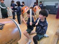 練習の様子を覗いてみると、5年生が4年生の手を取り、バチの持ち方を丁寧に教えたり、叩くコツを伝えたりする姿が見られました。 4年生が上手に叩けるようになると、飛び上がって喜ぶ5年生の姿もあり温かい交流が広がっています。 優しく教えてあげる姿ににっこりです。